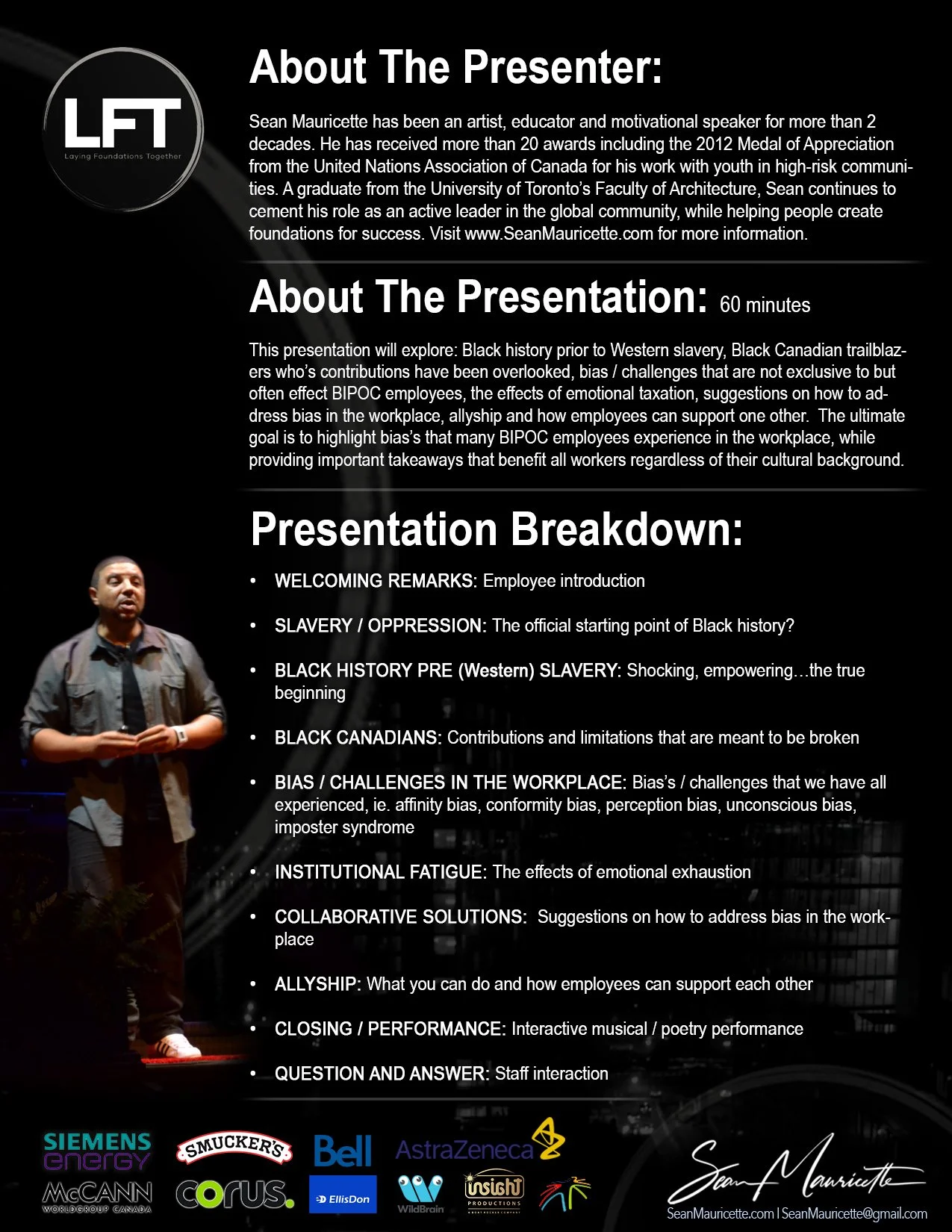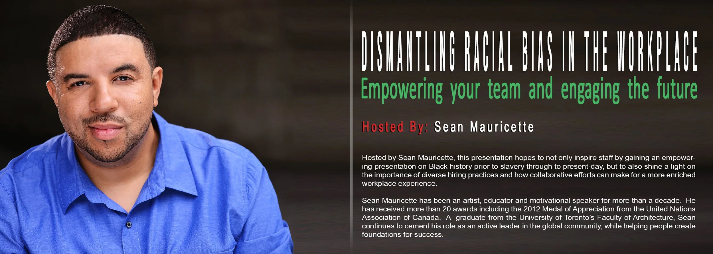 Perfect for a virtual ‘Lunch ’n Learn‘ style setting, Sean’s one hour talk will cover Black history prior to slavery, cycles of oppression and collaborative solutions to dismantle racial bias in the workplace. A high level look at how your company’s Anti-Black Racism initiatives align with strategies being applied both federally and provincially will be highlighted. By offering another starting point for Black history while exploring the varied Canadian Black experience, staff will feel emboldened, enlightened and motivated. Strategies and suggestions will be provided to help boost moral and productivity in your workplace.